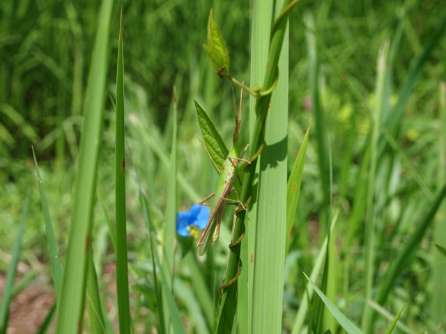 バッタの鮮やかな緑にしばし見とれる。草とまったく同じ色調の緑だなあ。まあ、当然な事なのですが。