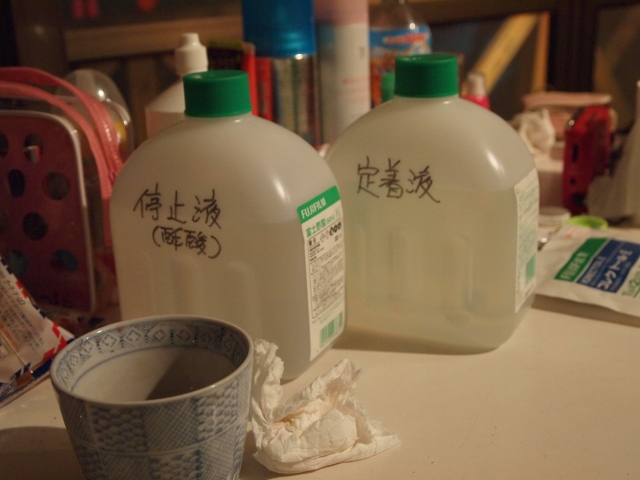 停止液の酢酸を床にぶちまけ、すっぱいにおいが台所に充満する。