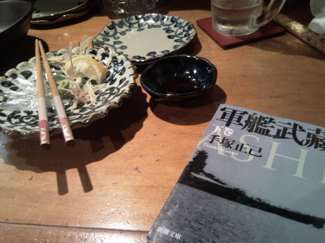 酒の友は文庫本。手塚正巳著の「軍艦武蔵」。これが結構すごい内容だ。