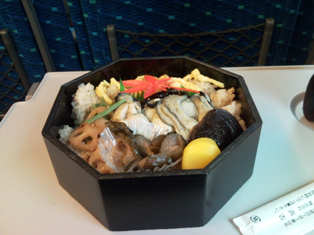 帰りはかきの釜飯の駅弁を食べた。うまいです。